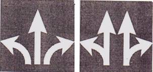خطوط متقاطعة متوازية : خطوط مسلك في شارع ذو ثلاثة مسالك أو اكثر - على من يسوق مركبة أو حيوان أن يسوق مركبته أو الحيوان في المسلك الأيمن الأقصى ولا يجوز له عبور الخطوط بجسم المركبة أو بقسمٍ منه إلا من اجل التجاوز أو من اجل تنفيذ أمرٍ قانوني |